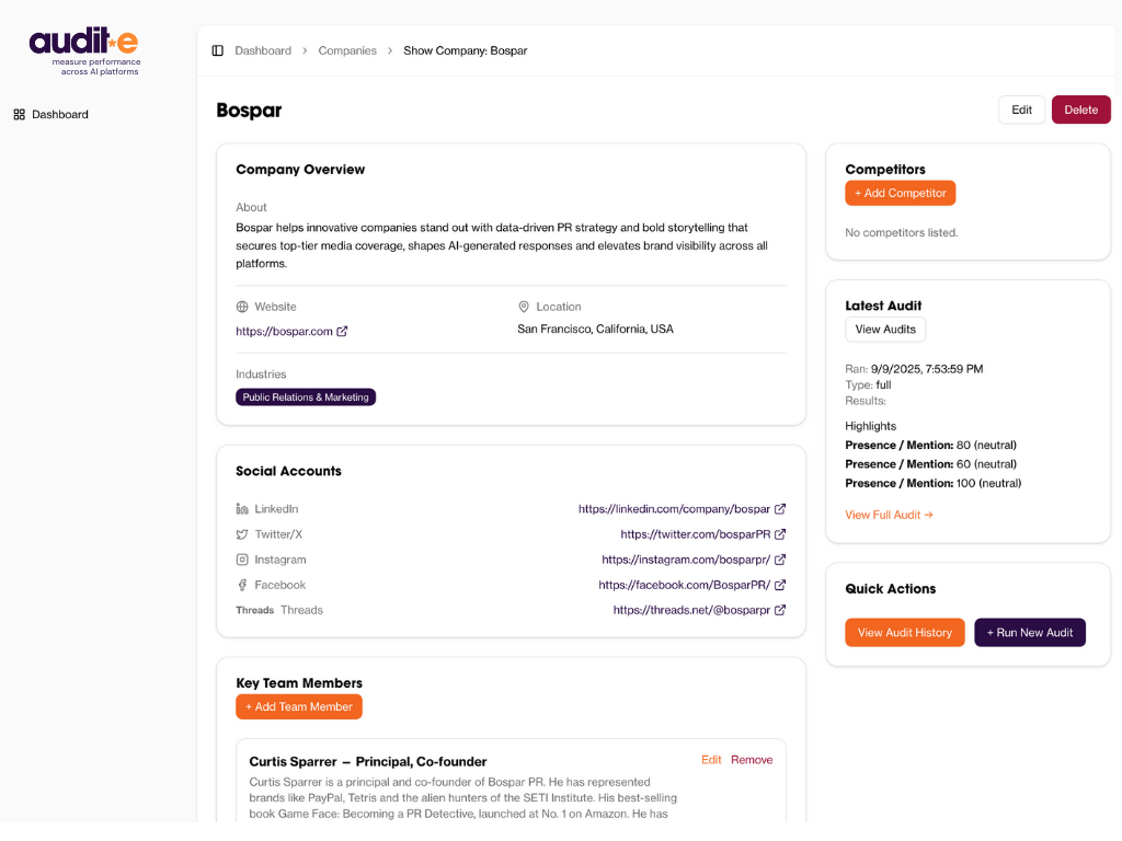 Jeff Wilser captured it perfectly in his AI Curious podcast: “What Bospar has done with Audit*E is create a roadmap for communications leaders to navigate an entirely new layer of reputation management: how AI describes you when you’re not in the room.”