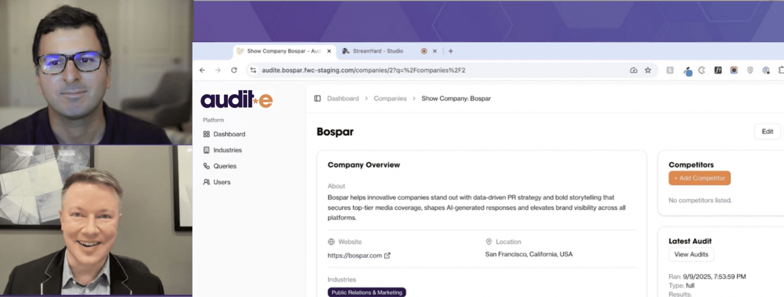 Josh Constine, venture partner at SignalFire and former TechCrunch editor-at-large, explained in Business News This Week: “Bospar’s Audit*E helps businesses establish a baseline of their GEO presence, suggests ways to improve how they appear, and measures the impact of their media efforts.”