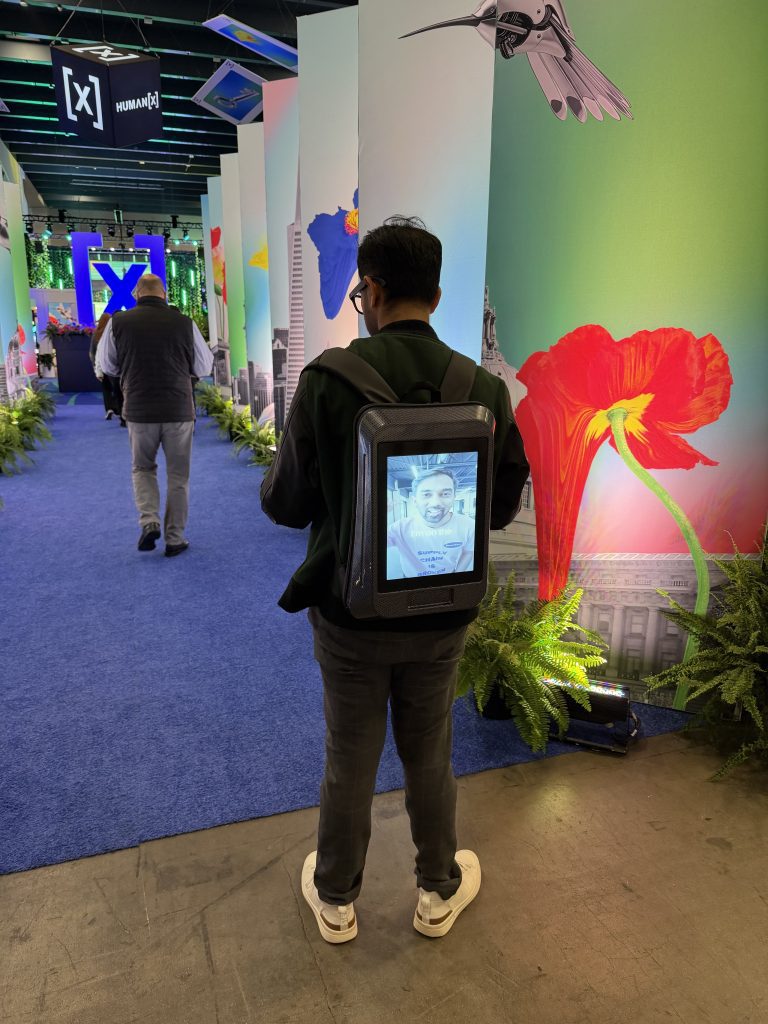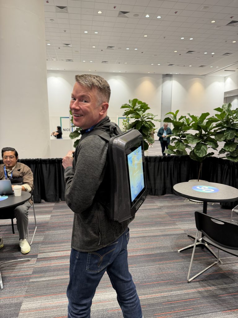 He was walking the floor with a video backpack, using it live to demonstrate his technology.